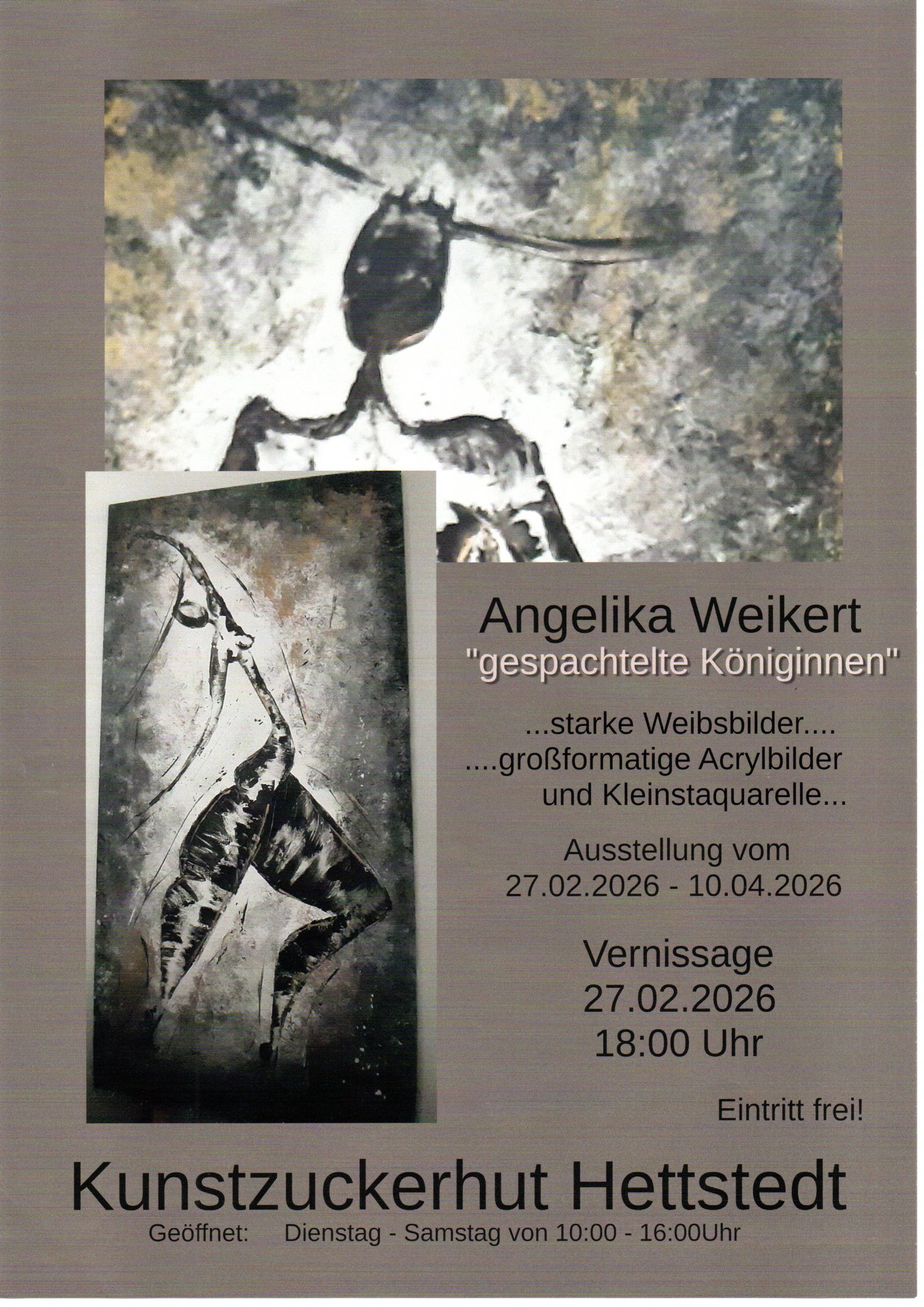 Vom 27.Februar bis 8. April 2026 zeigt die Sangerhäuser Künstlerin Angelika Weikert im Kunstzuckerhut Hettstedt ihre Ausstellung „gespachtelte Königinnen“.