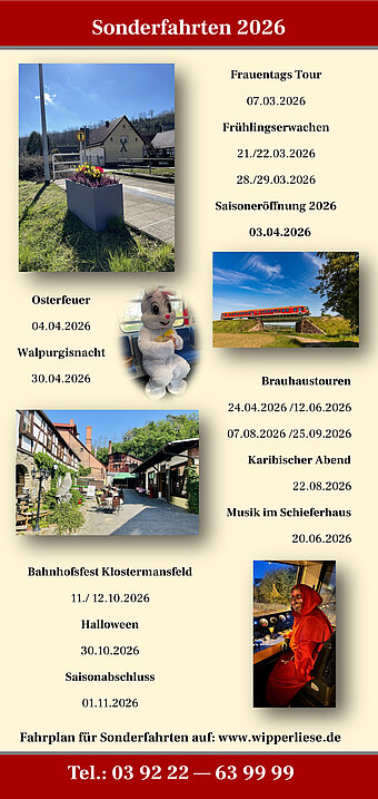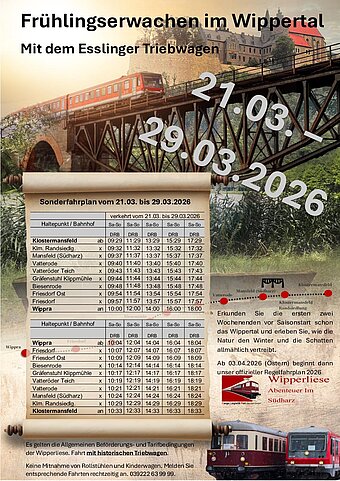 An den Wochenenden 21. und 22. März sowie 28. und 29. März 2026 haben Besucher die Gelegenheit, eine stimmungsvolle Frühlingsfahrt mit dem historischen Esslinger Triebwagen zu erleben. Gemütlich rollt der traditionsreiche Triebwagen durch die erwachende Natur des Wippertals. Saftige Wiesen, blühende Obstbäume und das sanfte Plätschern der Wipper begleiten die Fahrgäste auf einer nostalgischen Reise durch eine der schönsten Landschaften Sachsen-Anhalts. Die Fahrten verbinden Eisenbahnromantik mit Naturerlebnis. Große Panoramafenster ermöglichen einen weiten Blick in die frühlingshafte Landschaft, während der unverwechselbare Klang historischer Technik für authentische Eisenbahnatmosphäre sorgt.
