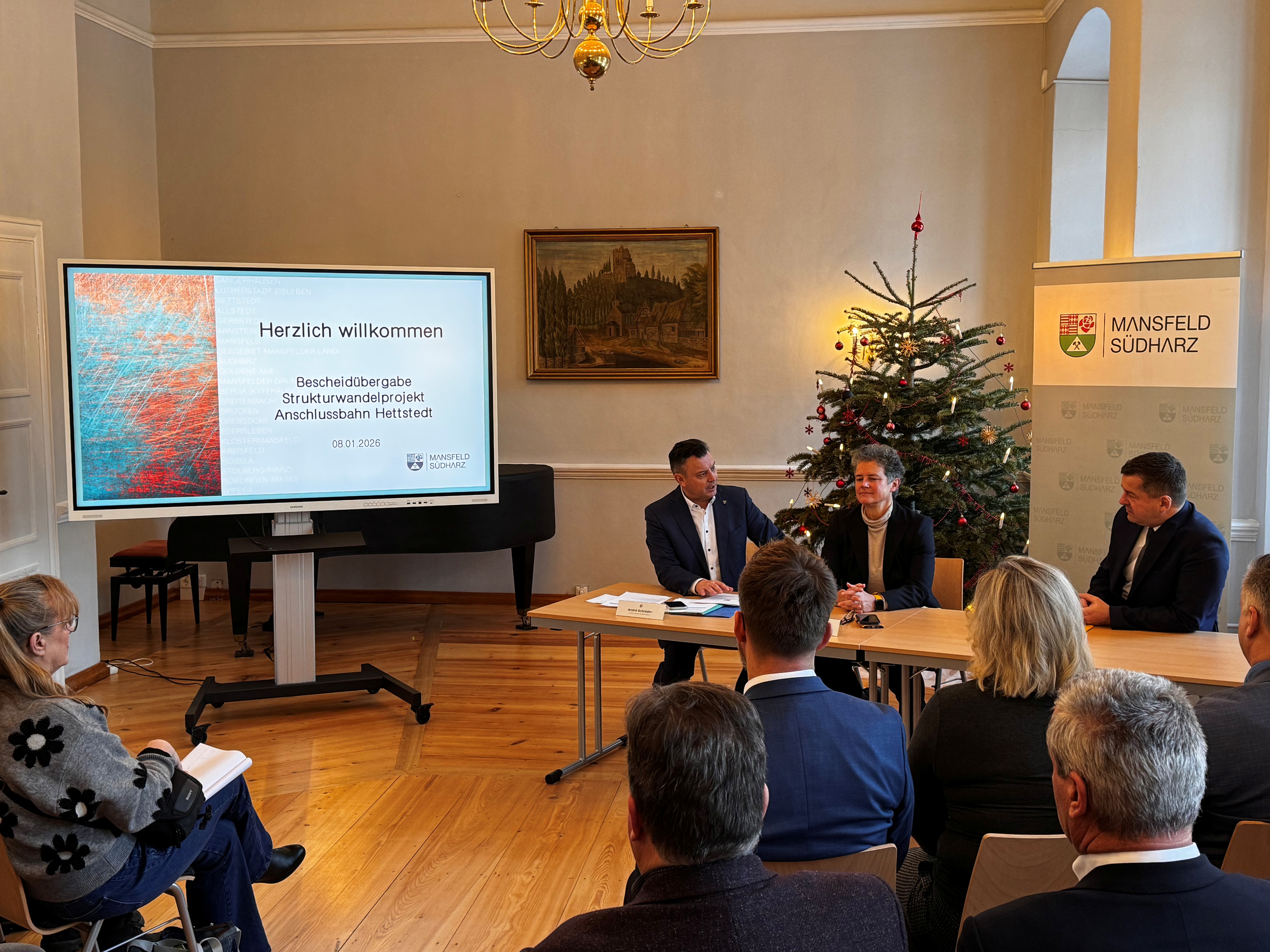 Als weiteren entscheidenden Schritt für den Strukturwandel hat der Landkreis Mansfeld-Südharz eine Förderung von Bund und Land in Höhe von gut 22,5 Millionen Euro gesichert. Die Mittel aus dem Programm „Sachsen-Anhalt Revier 2038“ fließen in den umfassenden Ausbau der Hauptanschlussbahn Hettstedt. Den offiziellen Bewilligungsbescheid nahm Landrat André Schröder heute von Infrastrukturministerin Dr. Lydia Hüskens und Wirtschaftsminister Sven Schulze entgegen.