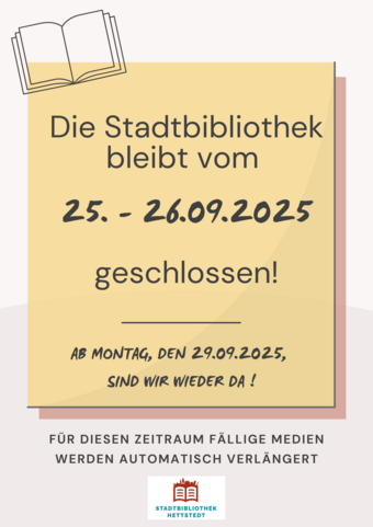 Alle Leser*innen der Stadtbibliothek Hettstedt möchten wir hiermit darauf hinweisen, dass die Stadtbibliothek Hettstedt vom 25. bis 26. September 2025…