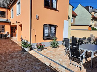 Einkaufsmöglichkeiten, Bäcker und Gaststätten sind fußläufig erreichbar. Hinter dem Haus befindet sich ein großer, mit Gartenmöbeln und Grill ausgestatteter Hof zur Alleinbenutzung. Auf einem angrenzenden, abgeschlossenem Hinterhof stehen 6 Parkplätze zur Verfügung.
