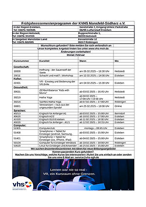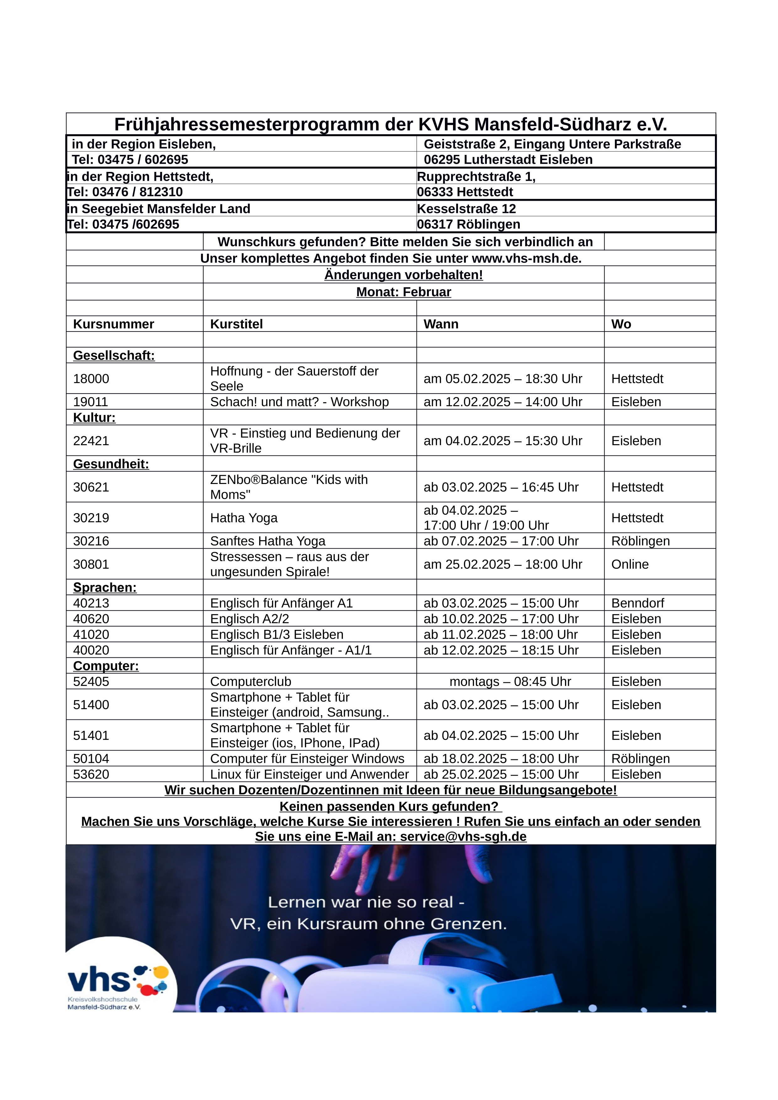 08.01.2025 Kursangebote Februar der Kreisvolkshochschule Mansfeld-Südahrz Das Frühjahrssemesterprogramm der KVHS Mansfeld-Südharz finden Sie hier: