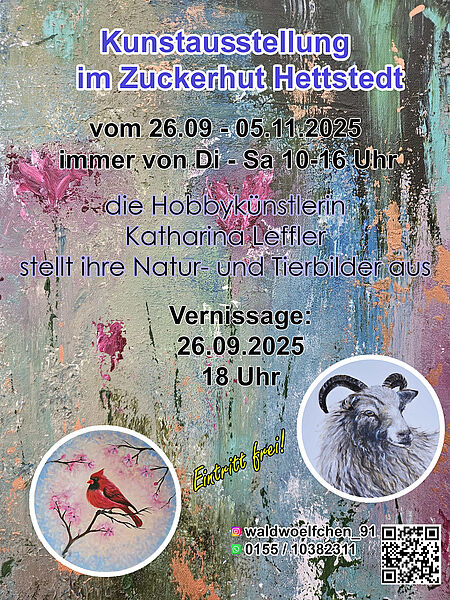 Am 26.09.2025 findet um 18:00 Uhr im Kunstzuckerhut Hettstedt eine neue Ausstellungseröffnung statt. In dieser Ausstellung stellt die aus Helbra stammende Hobbykünstlerin Katharina Leffler ihre Natur- und Tierbilder in Acryl aus.