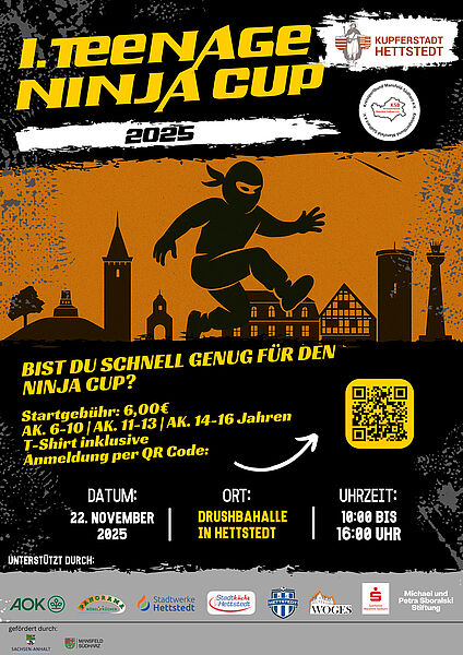 Am 22. November 2025 findet in der Kupferstadt Hettstedt erstmals der „Teenage-Ninja-Cup“ statt. Ausgestaltet vom Kreissportbund Mansfeld-Südharz e. V. in Zusammenarbeit mit der Stadt Hettstedt und dem FC Hettstedt e. V. verwandelt sich die Drushba-Sporthalle von 10 bis 16 Uhr in einen Parcours für Kinder und Jugendliche.