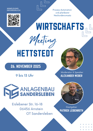Das nächste Wirtschaftsmeeting findet am 26.11.2025 von 9 bis 13 Uhr statt. Zur Anmeldung gelangen Sie hier: HETTSTEDTER Wirtschafts-Meeting - 26.11.2025